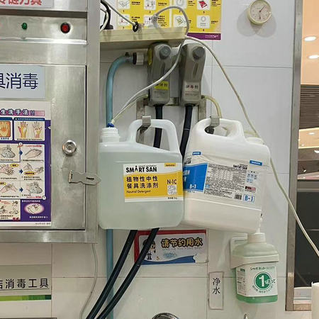 可懸掛一種清洗消毒液體,按比例自動混合,直接可以沖洗。 自動混合液體方便使用。